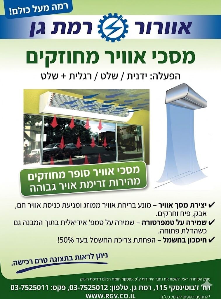 התקנת מסך אוויר מאפשרת לכם לשמור על "דלת פתוחה" שמזמינה את הלקוחות להיכנס, להתרשם ולקנות, וכל זאת תוך חיסכון דרמטי בעלויות החשמל המאמירות של הקיץ הישראלי. מדובר בחיסכון מצטבר של מאות ואלפי שקלים לאורך עונת הרחצה – השקעה שמחזירה את עצמה במהירות שיא.