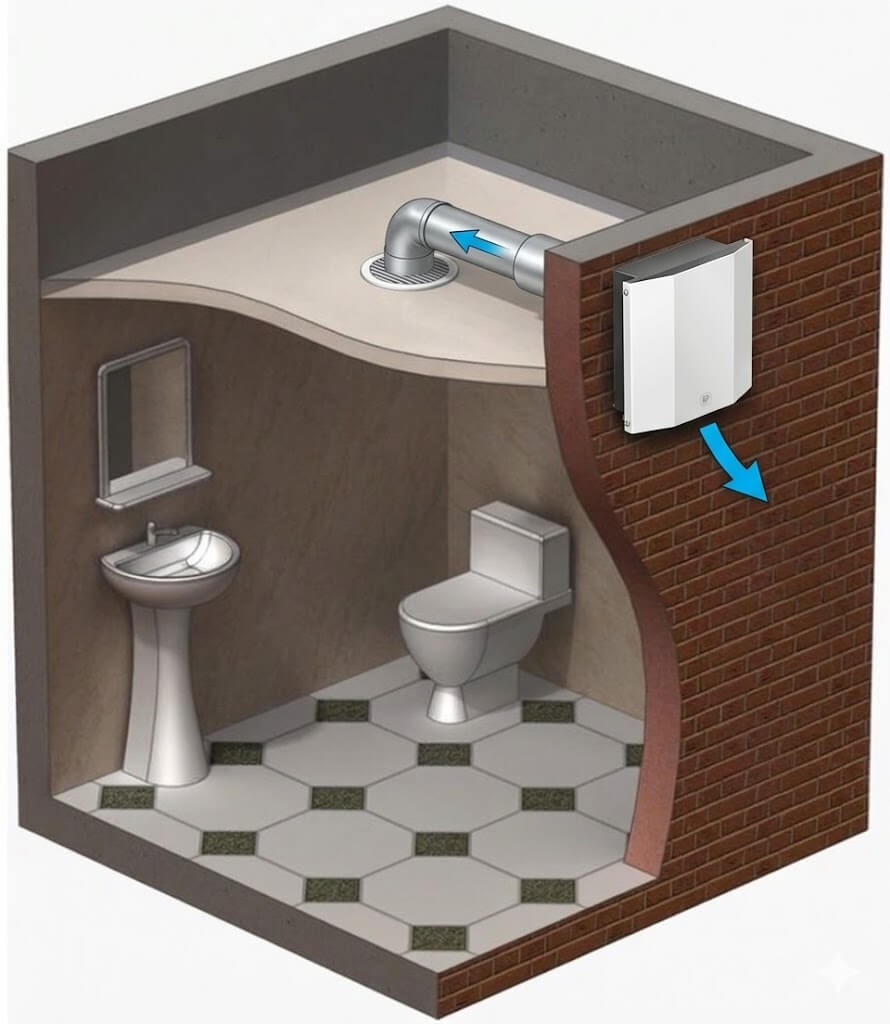 חדרי רחצה ושירותים: סילוק מהיר של אדים ולחות למניעת עובש וריחות לא נעימים, כאשר המפוח מותקן על הקיר החיצוני ומונע רעש בתוך החדר.